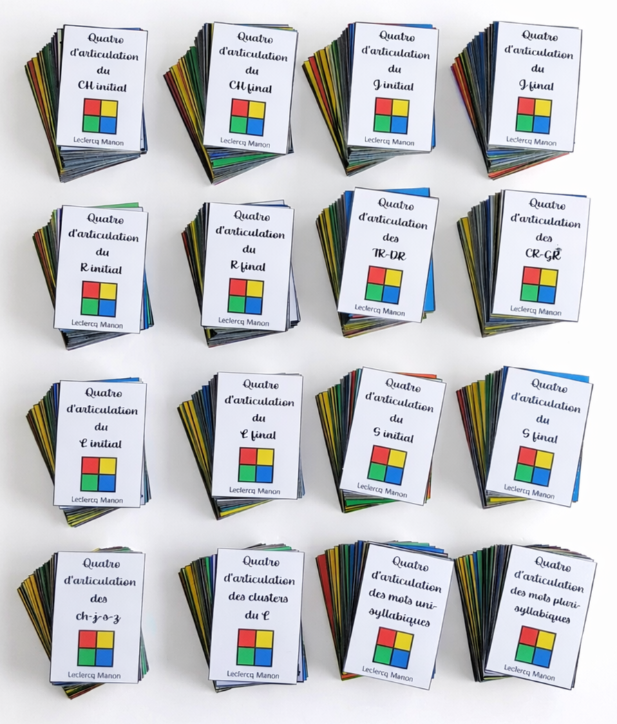 Chaque quatro se présente sous la forme d'un paquet de cartes cartonnées et plasitifées prêt à l'emploi, et cible un phonème particulier dans une position spécifique.